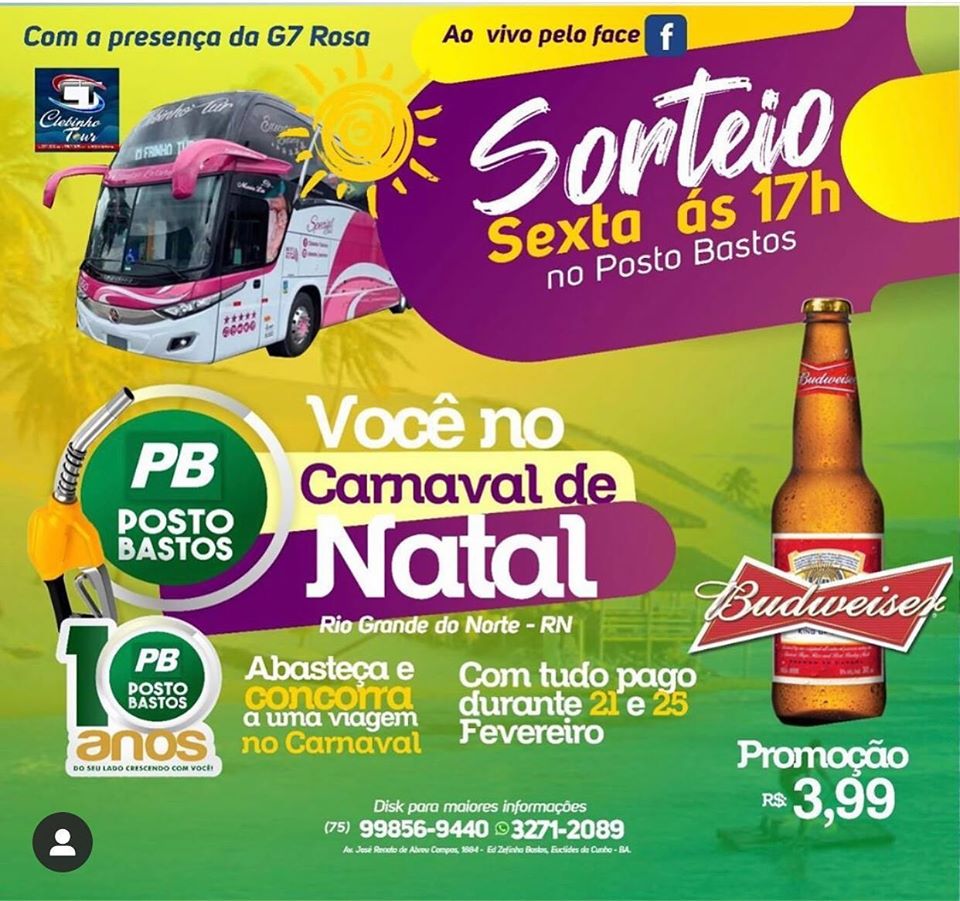 Em comemoração aos 10 anos do Posto Bastos em Euclides da Cunha, haverá nessa sexta-feira às 17h, o sorteio que irá premiar uma viagem turística com a empresa Clebinho Tour para a cidade de Natal, Rio Grande do Norte – RN, com tudo pago. Essa incrível viagem será no feriado de Carnaval, nos dias 21 até 25 de Fevereiro. Venha prestigiar esse momento, o ganhador pode ser você! Lembrando que teremos a presença do G7 Rosa e uma super promoção com Budweiser por R$ 3,99 para você se refrescar enquanto vibra na torcida.