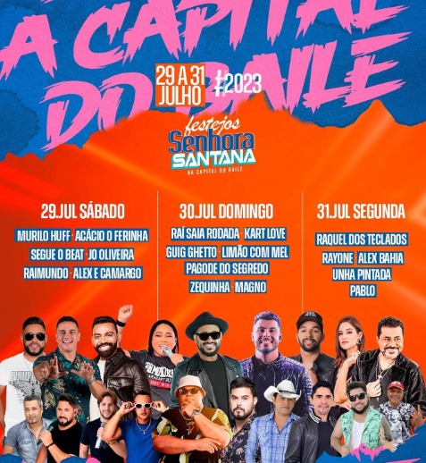 Com promoção da prefeitura de Cansanção, as atrações para os três dias de festa estão divididas da seguinte forma. Neste sábado, os festejos estão por conta de Murilo Huff, Acácio o Ferinha, Segue o Beat, Jo Oliveira, Ramundo e Alex e Carvalho. No segundo dia, domingo (30), o time escalado para animar o público ficou a cargo de Raí Saia Rodada, Kart Love, Guig Guett, Limão com mel, Pagode do segredo, Zequinha e Magno. E para fechar com chave de ouro a Festejos de Senhora Sant’Ana, Raquel dos teclados, Rayone, Alex Bahia, Unha Pintada e o contor Pablo serão responsáveis pela festa na segunda-feira (31).